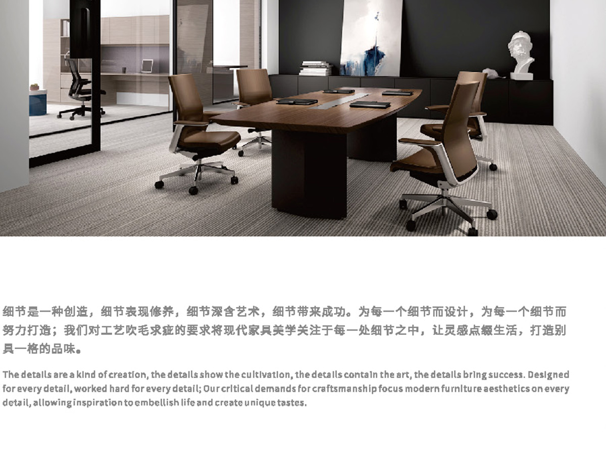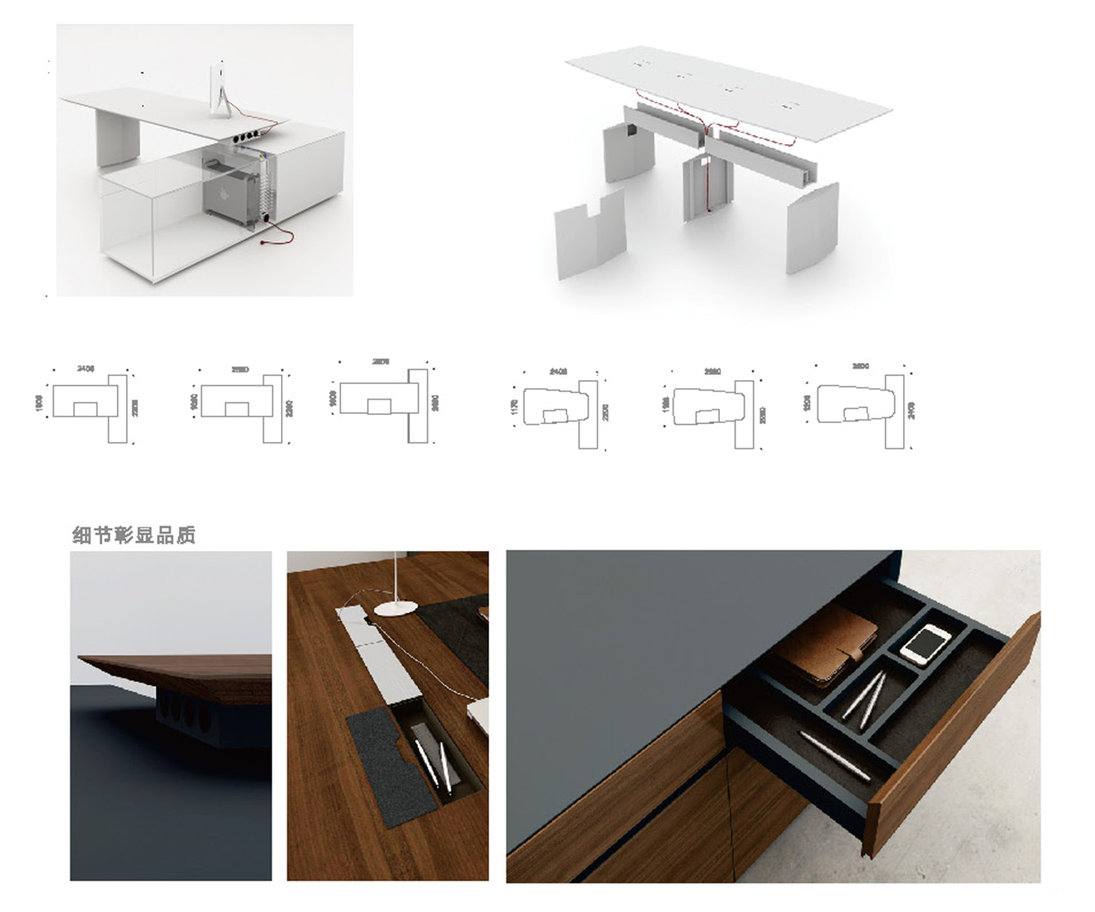 細節(jié)是一種創(chuàng)造,細節(jié)表現(xiàn)修養(yǎng),細節(jié)深含藝術(shù),細節(jié)帶來成功。為每一個細節(jié)而設(shè)計,為每一個細節(jié)而努力打造,我們對工藝吹毛求疵的要求將現(xiàn)代家具美學(xué)關(guān)注于每一處細節(jié)之中,讓靈感點綴生活,打造別縣一格的品味。臺面下副柜頂支撐配備了智能排插及走線孔,再也不用擔心走線不合理散亂等問題了。細膩拉絲不銹鋼飾面之下,是用心細膩的毛氈,讓你每一次使用在靜默中體驗。