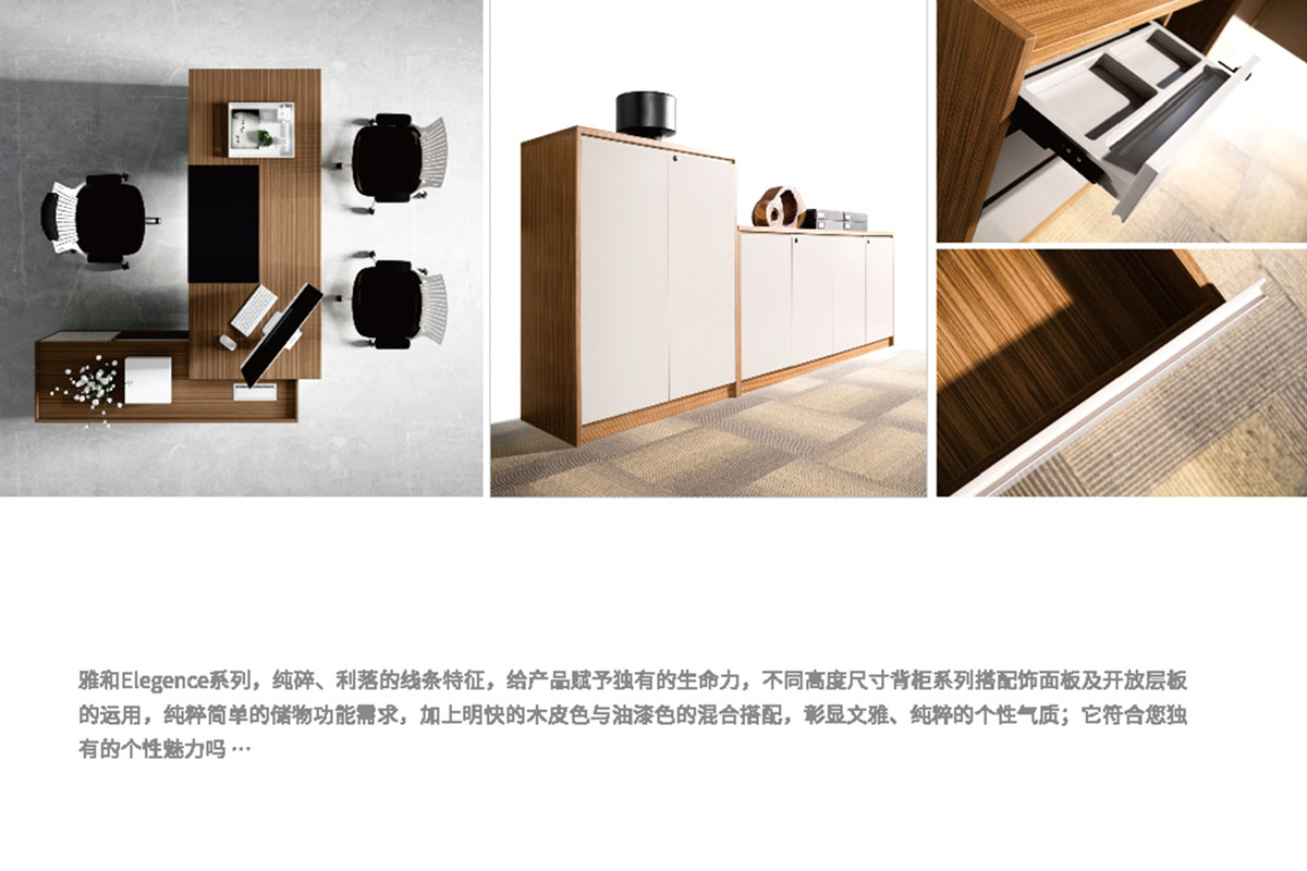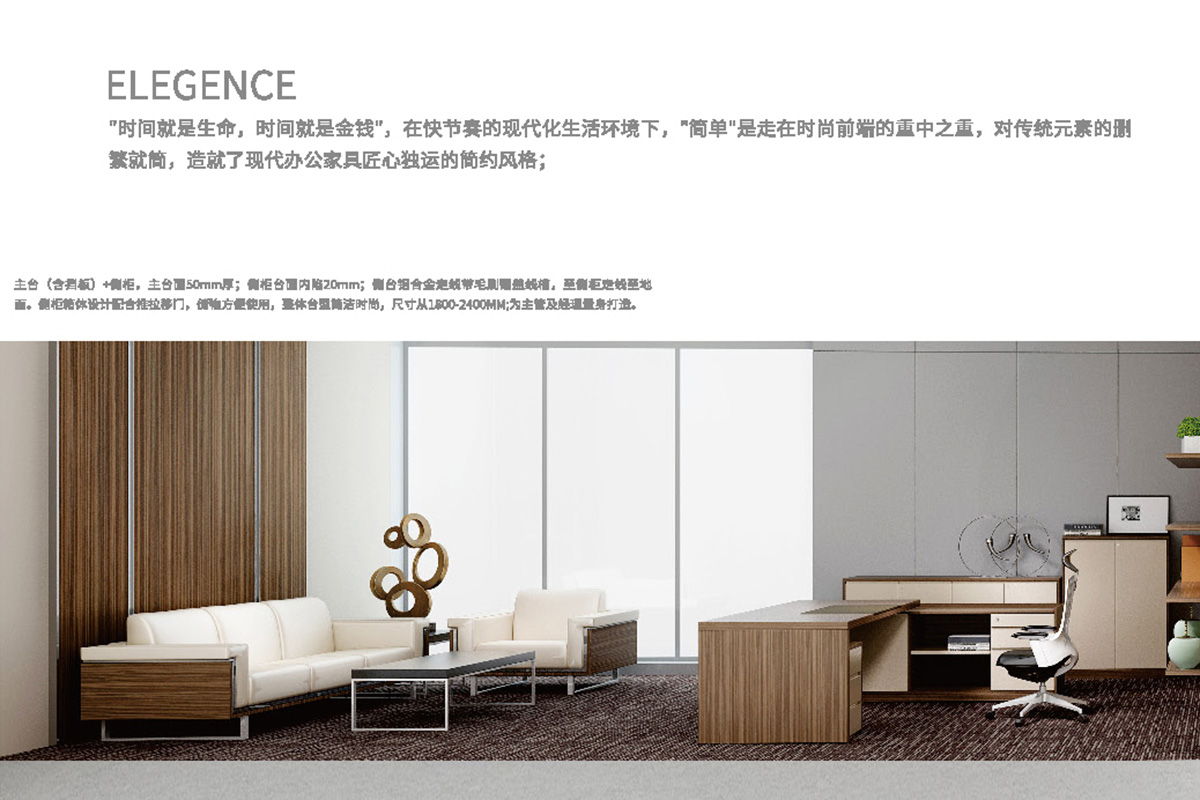 雅和Elegence系列,純碎、利落的線條特征,給產(chǎn)品賦予獨(dú)有的生命力,不同高度尺寸背柜系列搭配飾面板及開放層板的運(yùn)用,純粹簡單的儲物功能需求,加上明快的木皮色與油漆色的混合搭配,彰顯文雅、純粹的個性氣質(zhì),它符合您獨(dú)有的個性魅力嗎?。?!"時間就是生命,時間就是金錢”,在快節(jié)賽的現(xiàn)代化生活環(huán)境下,"簡單"是走在時尚前端的重中之重,對傳統(tǒng)元素的刪繁就簡,造就了現(xiàn)代辦公家具匠心獨(dú)運(yùn)的簡約風(fēng)格。