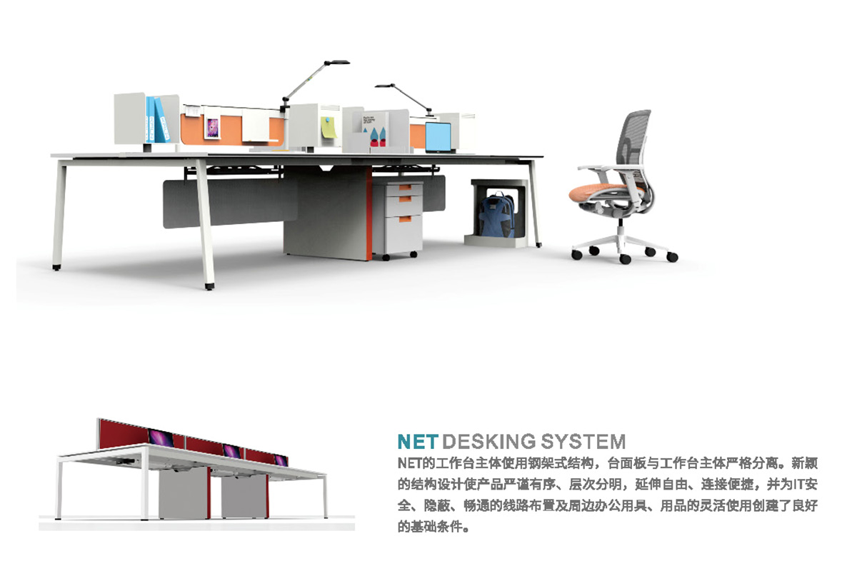 NET的工作臺主體使用鋼架式結(jié)構(gòu),臺面板與工作臺主體嚴(yán)格分離。新穎的結(jié)構(gòu)設(shè)計(jì)使產(chǎn)品嚴(yán)謹(jǐn)有序、層次分明,延伸自由、連接便捷,并為IT安全、隱蔽、暢通的線路布置及周邊辦公用具、用品的靈活使用創(chuàng)建了良好的基礎(chǔ)條件。
