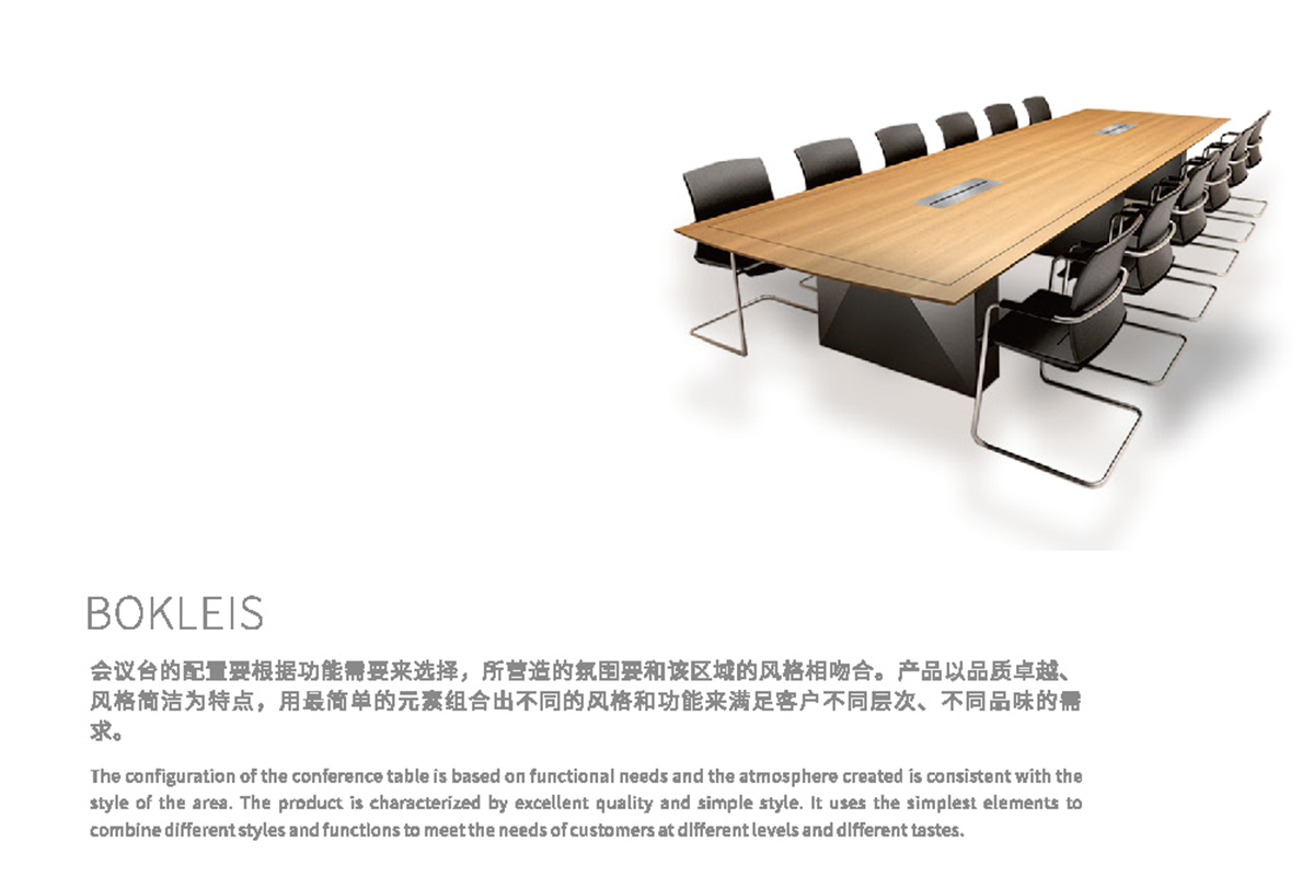 會(huì)議臺(tái)的配置要根據(jù)功能需要來(lái)選擇,所營(yíng)造的氛圍要和該區(qū)域的風(fēng)格相吻合。產(chǎn)品以品質(zhì)卓越風(fēng)格筒潔為特點(diǎn),用最簡(jiǎn)單的元賽組合出不同的風(fēng)格和功能來(lái)滿足客戶不同層次、不同品味的需求。