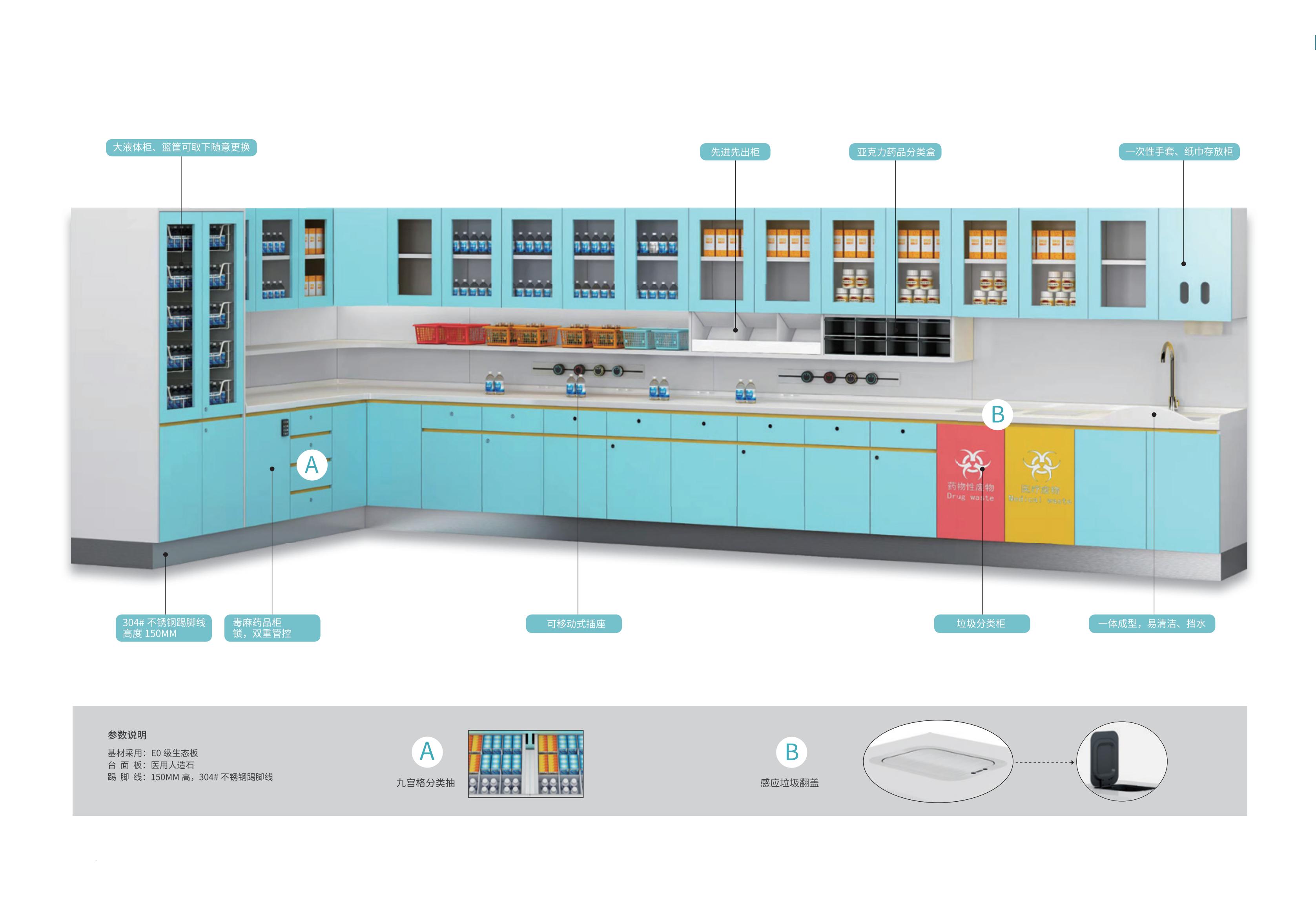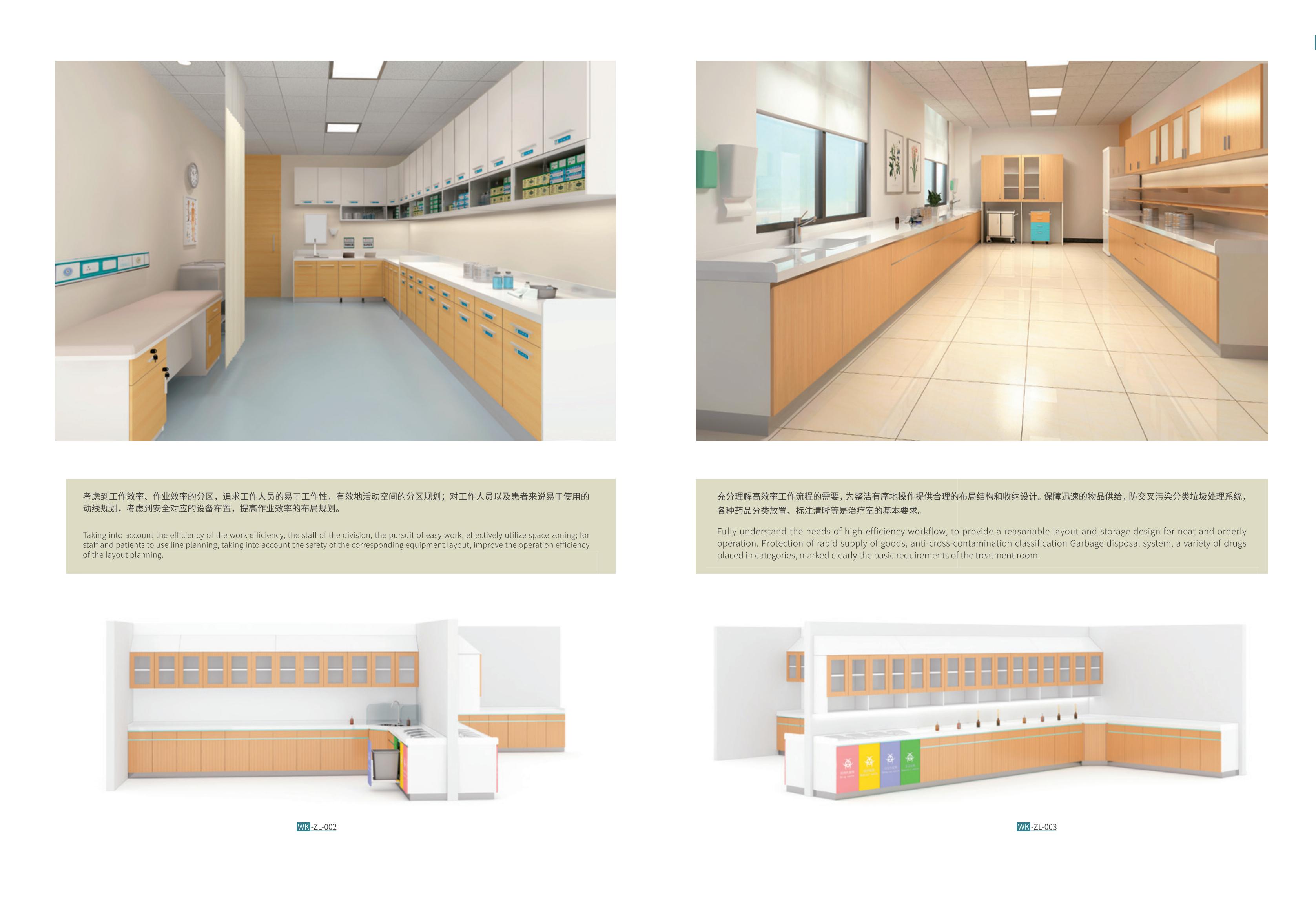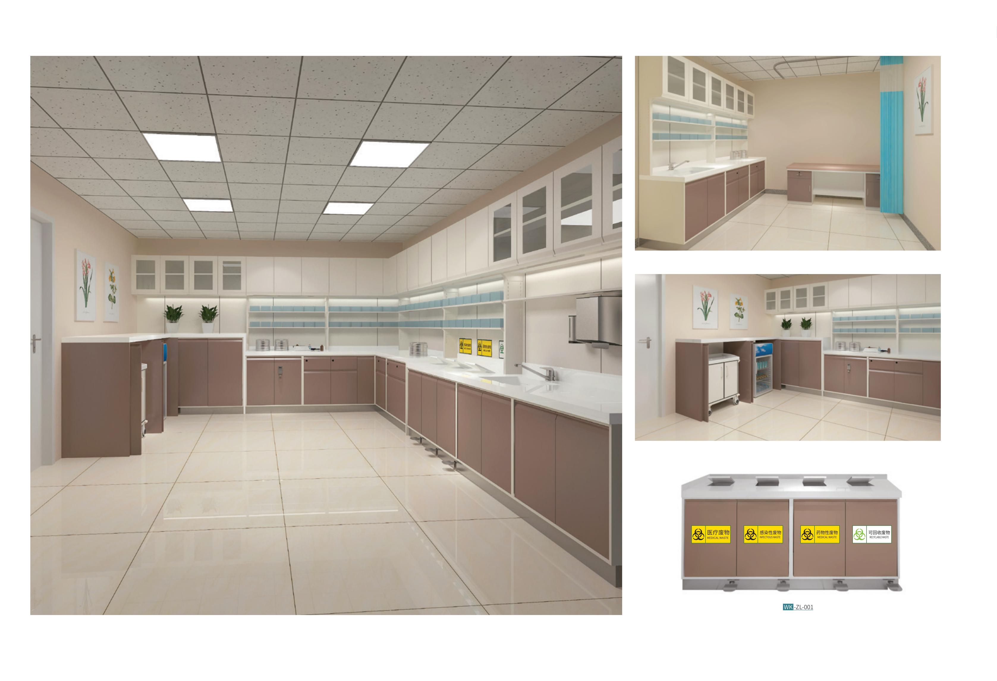 根據(jù)醫(yī)院的配藥室、治療室、處理室等功能特點來設(shè)計,在功能設(shè)計上,考慮醫(yī)院物品的潔、污層次分類,強調(diào)防止交叉感染,從根本上為醫(yī)療人員提供安全清潔的使用環(huán)境。治療室的布置應(yīng)當簡潔、舒適和實用,既不過于單調(diào)和缺乏人情味;以滿足基本功能和實用為最佳。
