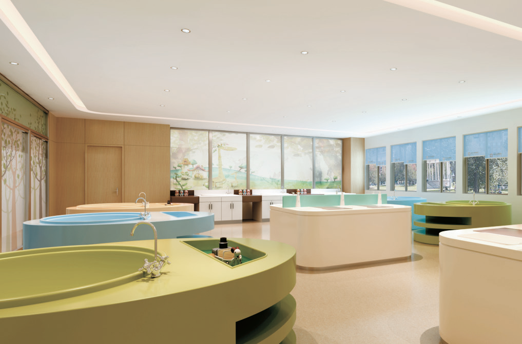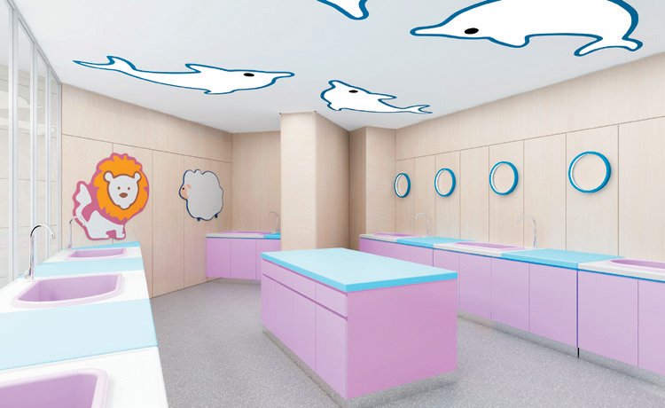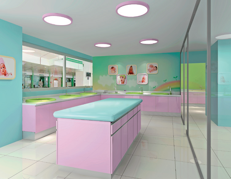 洗嬰室是新生兒護理的主要場所,集中了新生兒皮膚護理、眼部護理、臍部護理等多項操作,所以現(xiàn)代新生兒洗嬰室醫(yī)療空間設(shè)計需要與使用家具一道進行整體設(shè)計,注重安全、預(yù)防感染,營造符合嬰幼兒特征的活潑可愛、安全溫馨的場景氛圍。