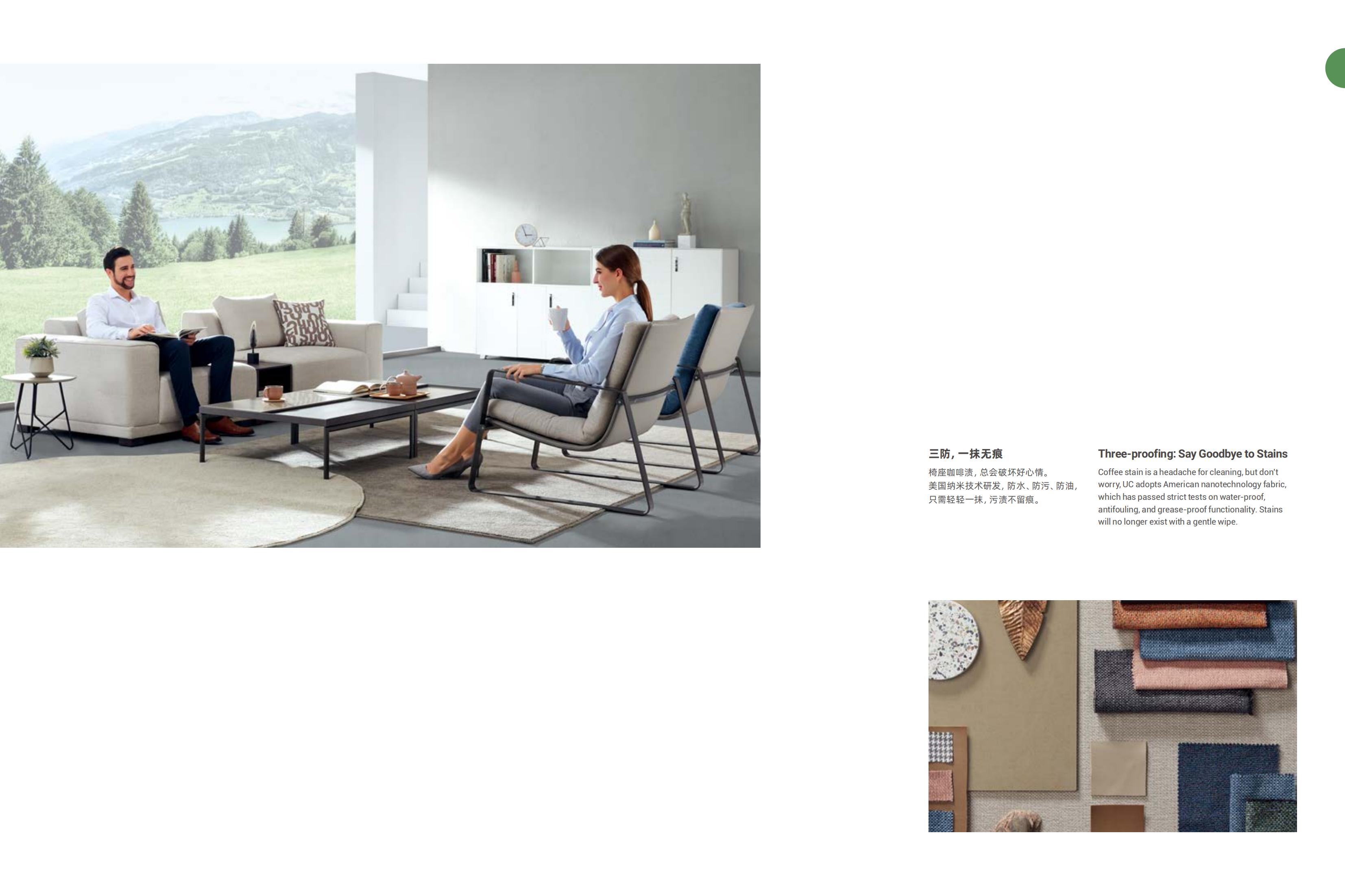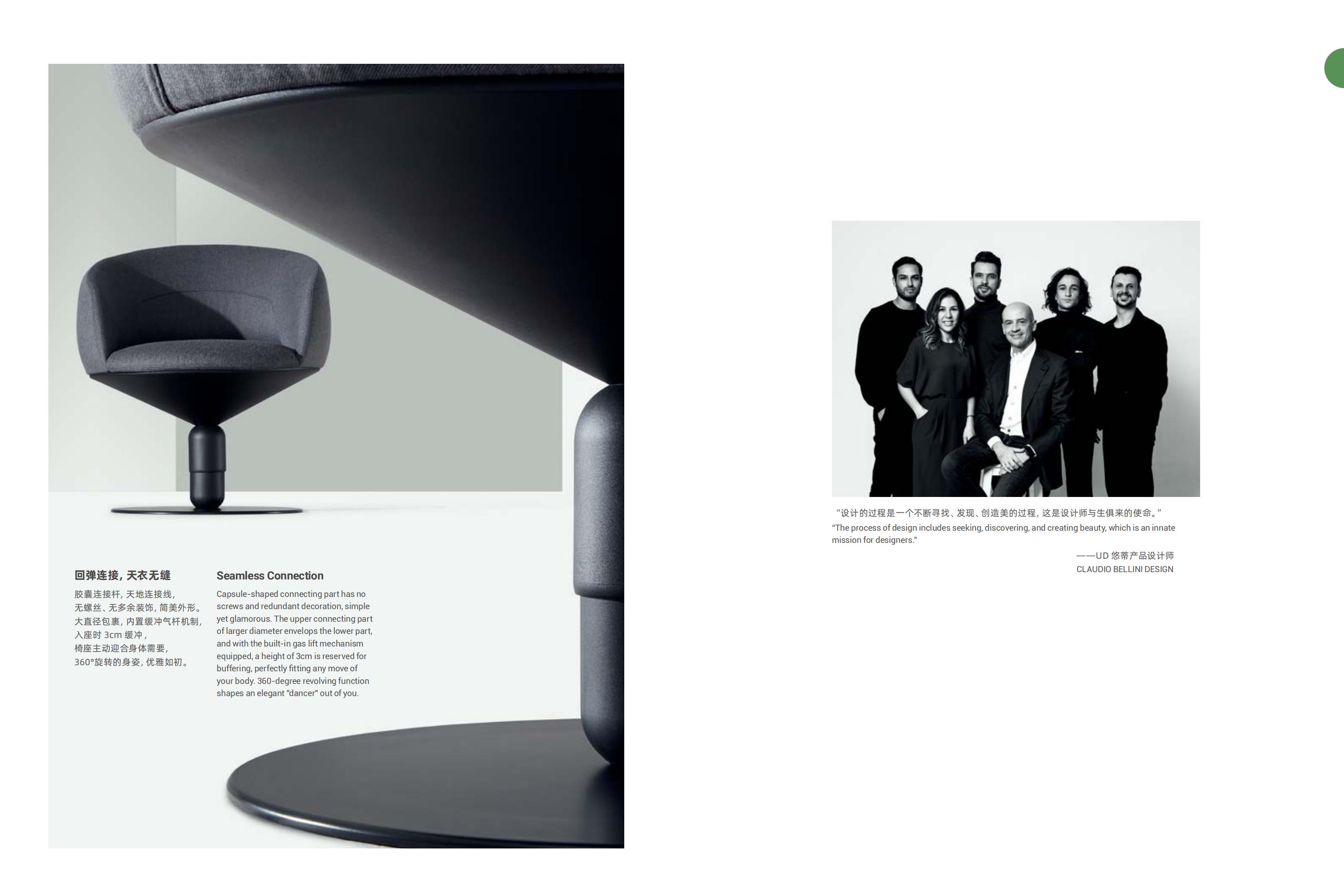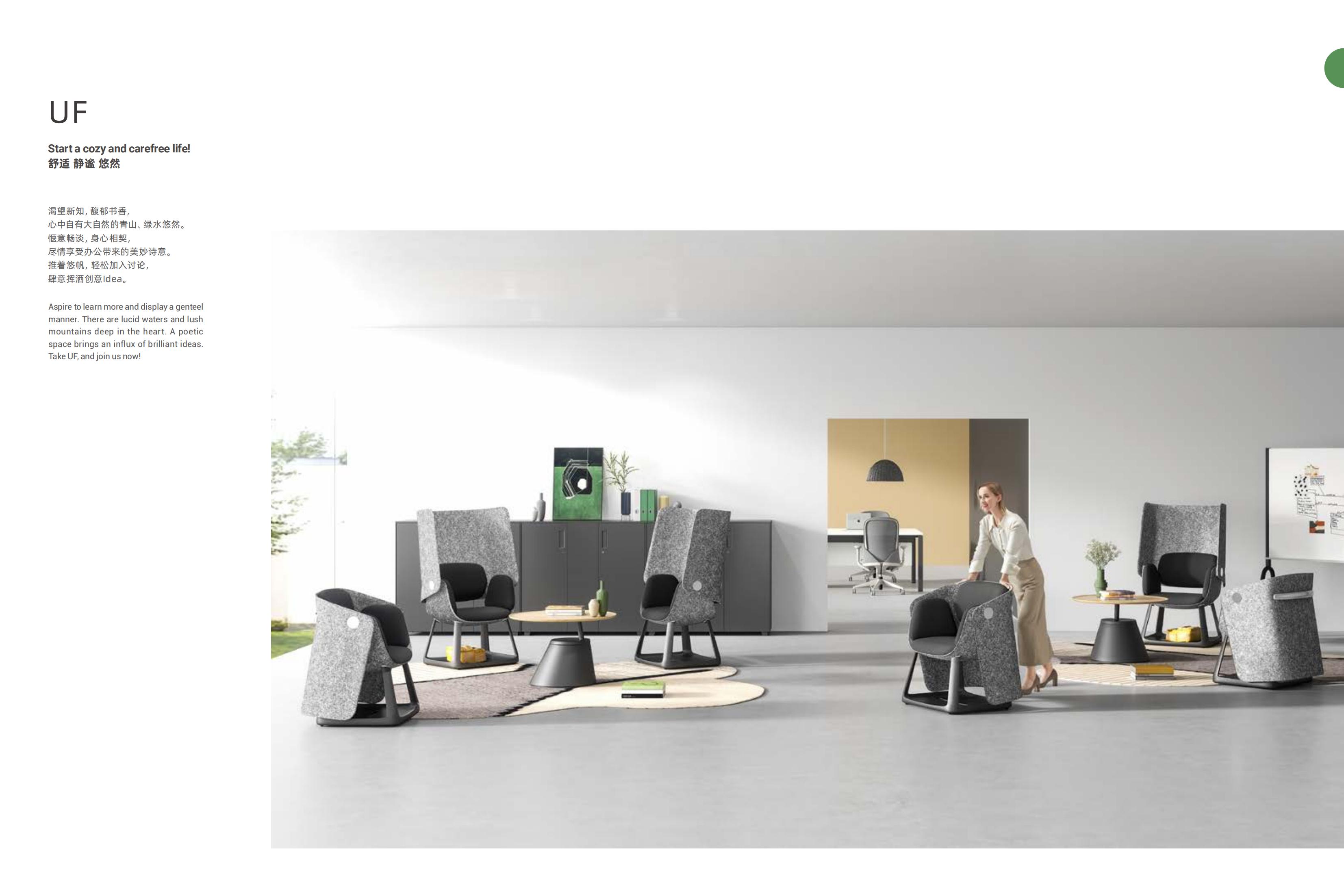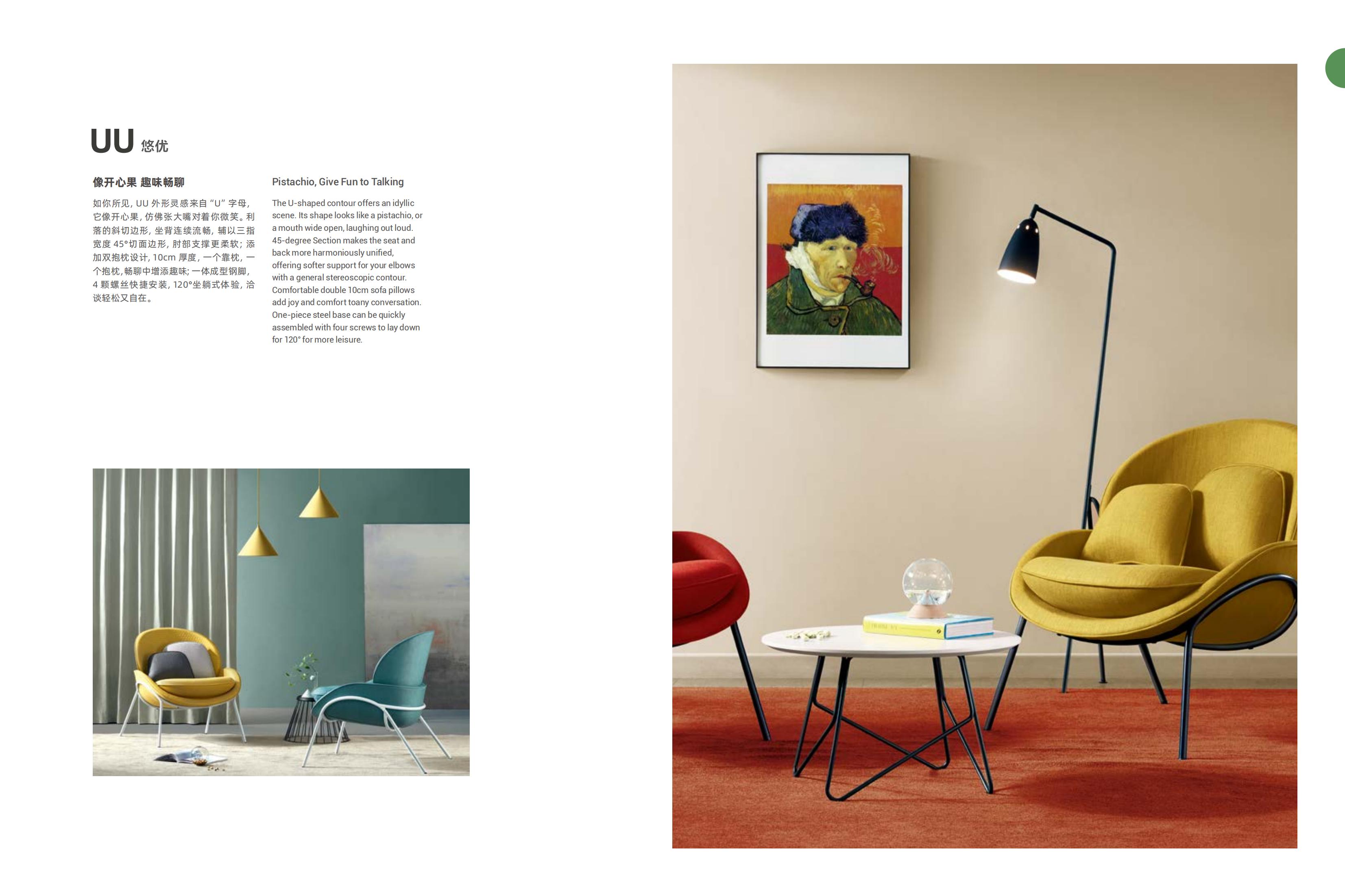 如你所見(jiàn),UU 外形靈感來(lái)自“U”字母, 它像開(kāi)心果,仿佛張大嘴對(duì)著你微笑。利落的斜切邊形,坐背連續(xù)流暢,洽談?shì)p松又自在。