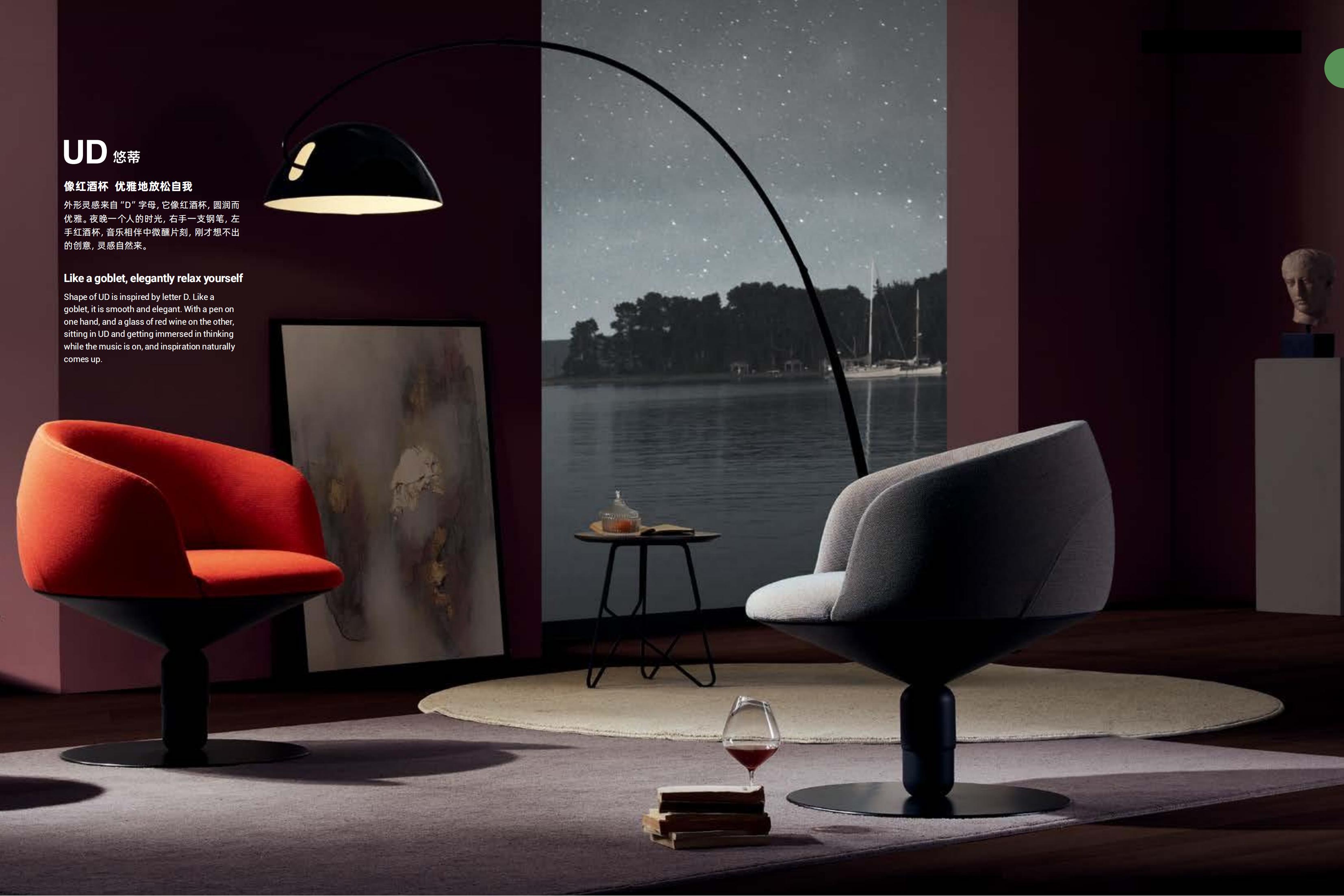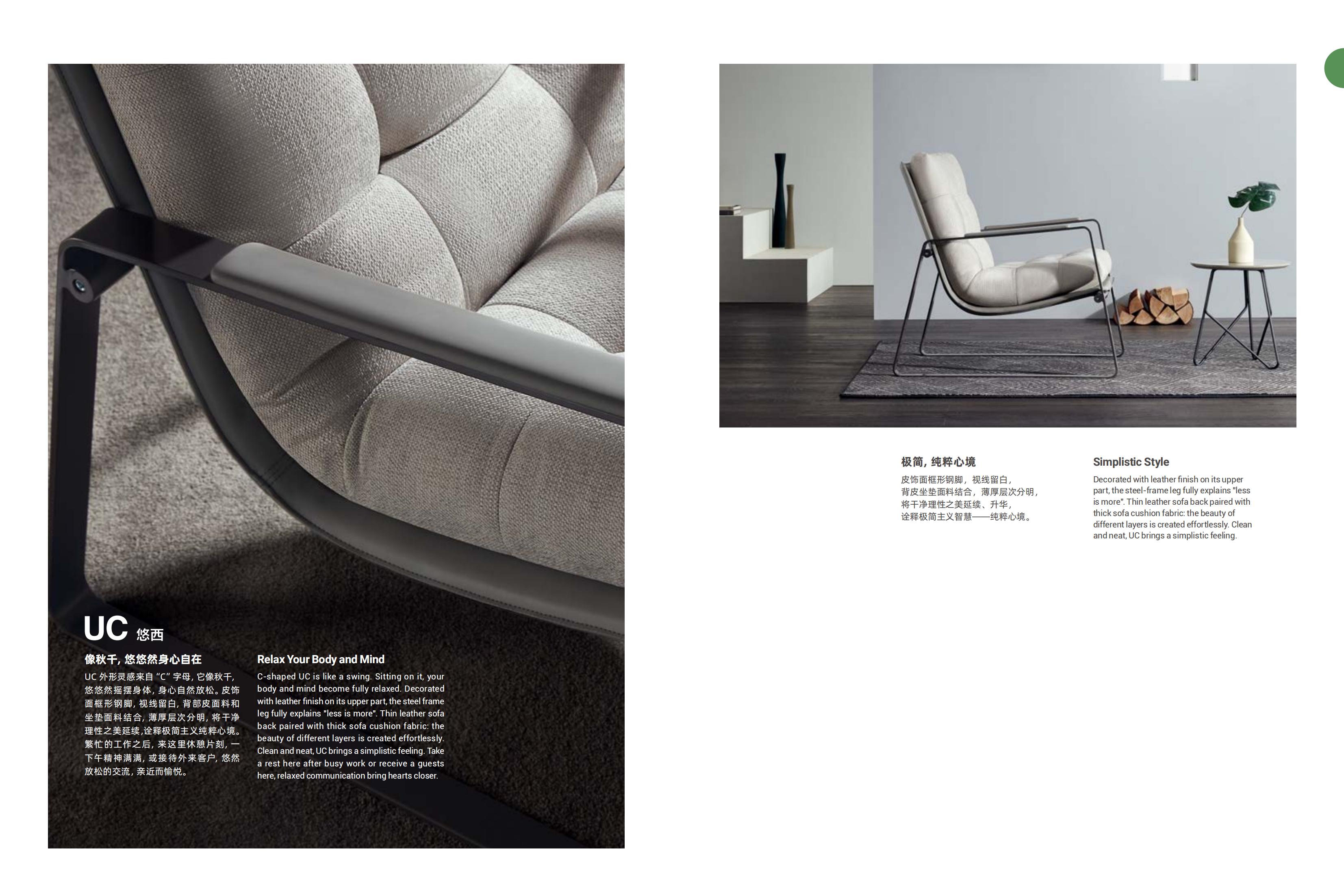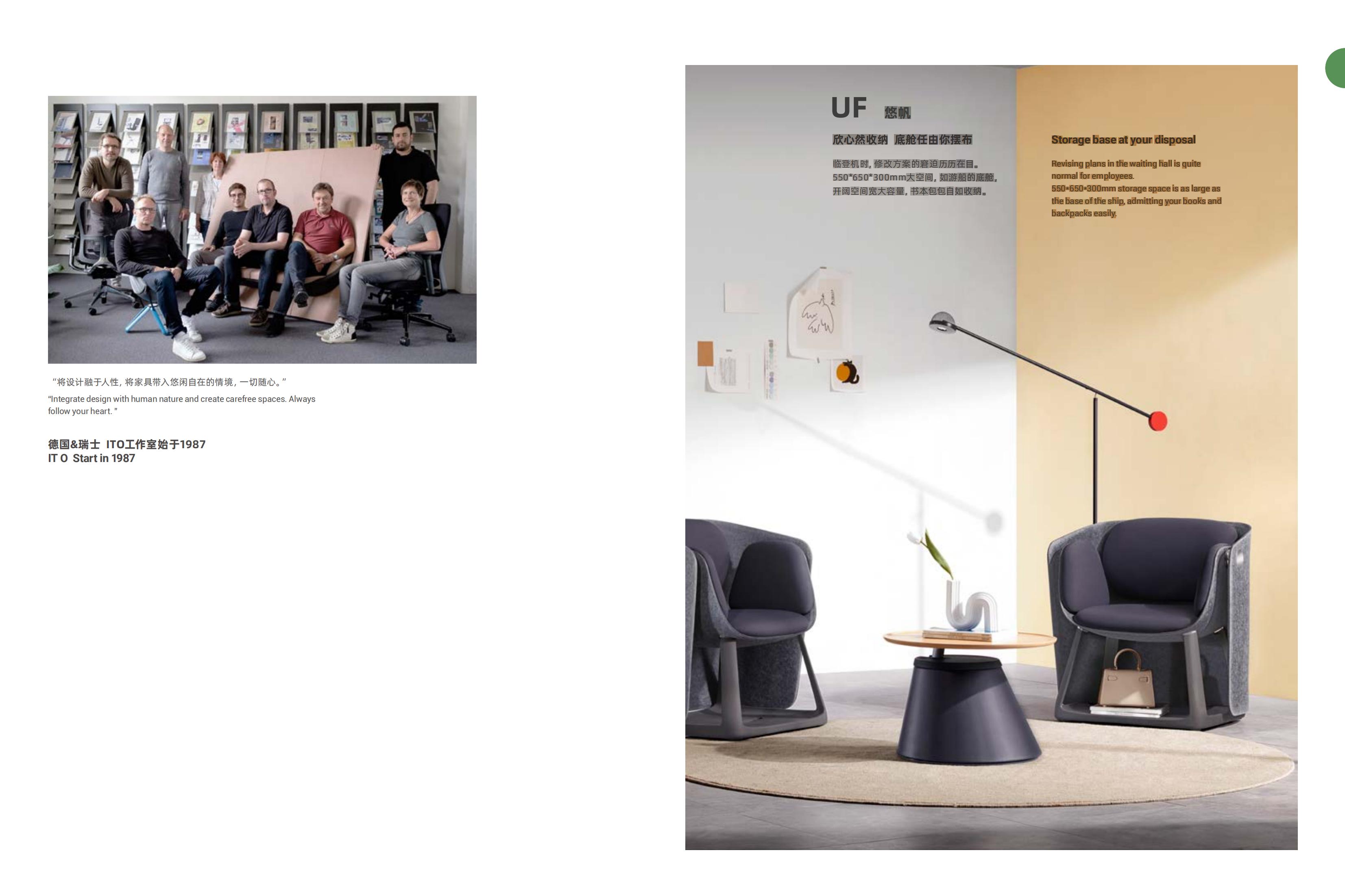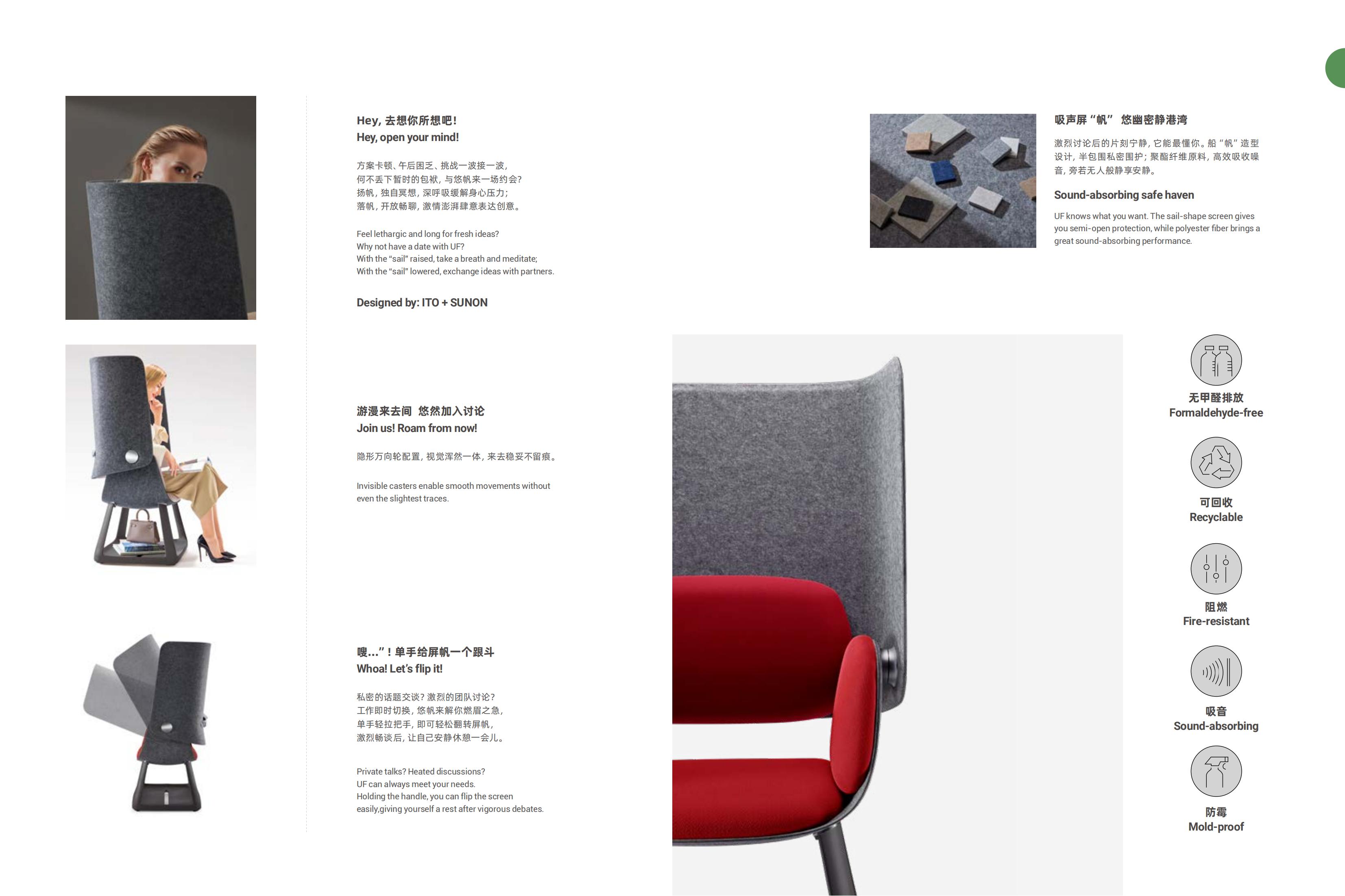 如你所見(jiàn),UU 外形靈感來(lái)自“U”字母, 它像開(kāi)心果,仿佛張大嘴對(duì)著你微笑。利落的斜切邊形,坐背連續(xù)流暢,洽談?shì)p松又自在。
